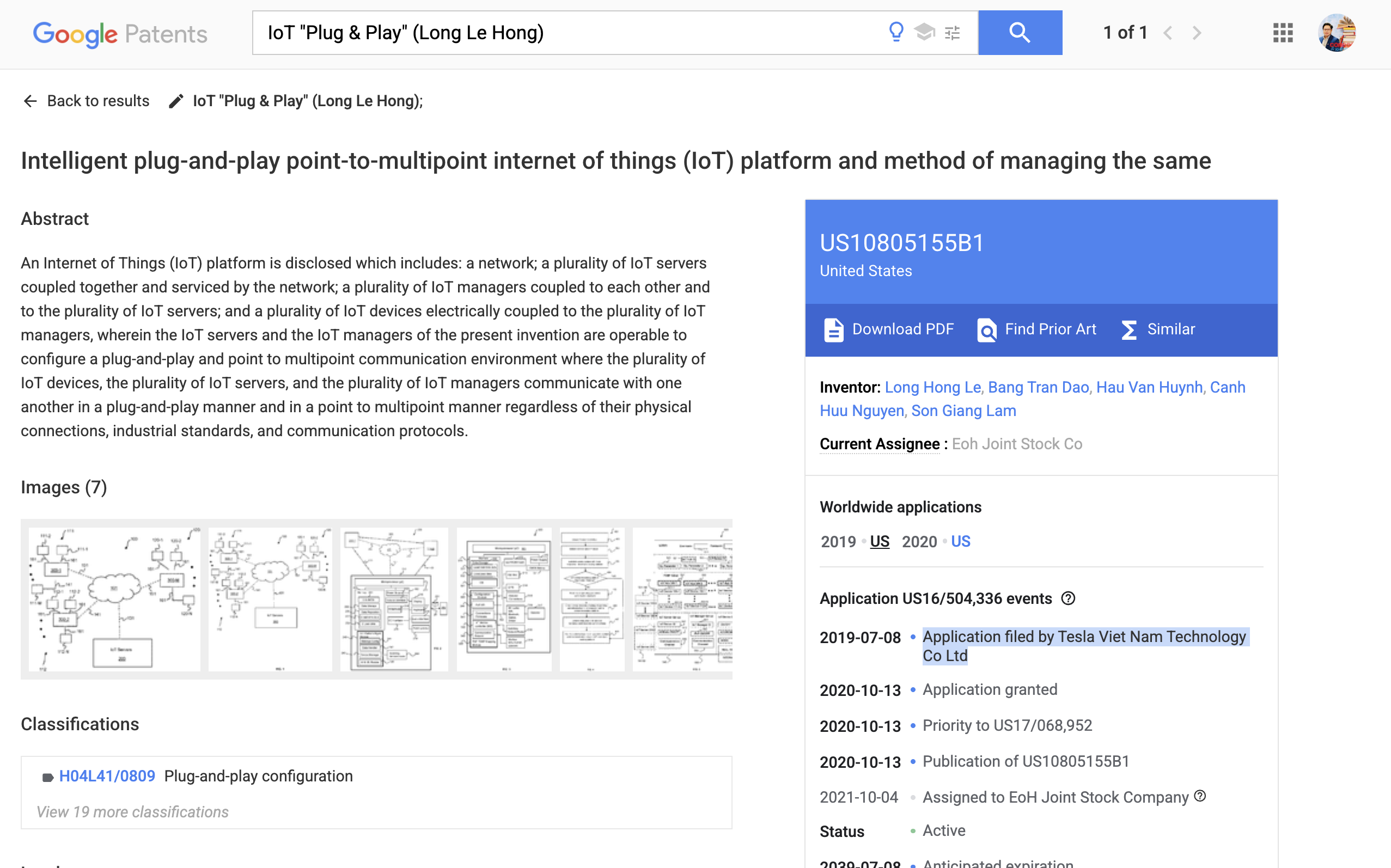 Đi sau trong công nghệ IoT, nhưng Lê Hồng Long đã thành công lấy bằng sáng chế tại Mỹ. Chia sẻ với phóng viên Báo Đầu tư, nhà sáng lập Công ty TNHH EOH tiết lộ, sau 13 tháng nộp đơn, vào ngày 13/10/2020, công nghệ IoT "Plug & Play" do EOH sở hữu đã được cấp bằng sáng chế độc quyền bởi Tổ chức Sáng chế và Nhãn hiệu Mỹ (USPTO).