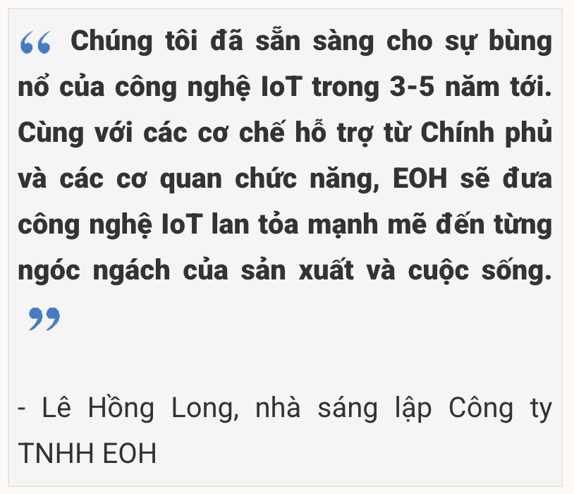 Nhận thấy tiềm năng của lĩnh vực Internet vạn vật (IoT), Lê Hồng Long, nhà sáng lập Công ty TNHH EOH đã nhanh chóng nhập cuộc bằng cách thành lập nền tảng IoT mở đầu tiên tại Việt Nam.